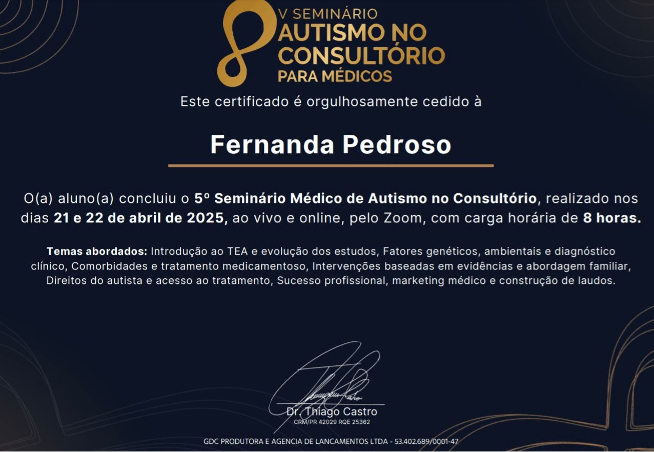 Quero agradecer e parabenizar a dra. Fernanda Pedroso pelo seu comprometimento de excelência com a medicina, sua gentileza, atenção e empatia. Até a próxima consulta! :)
